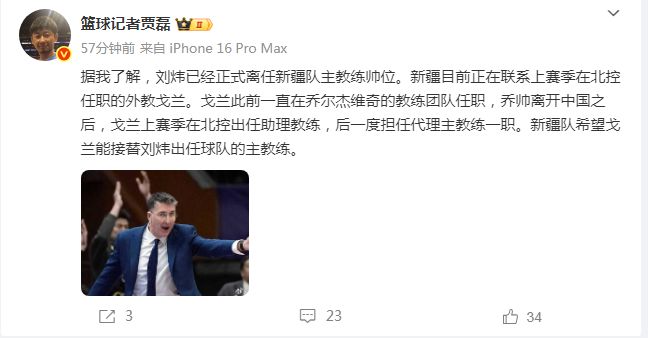 只是如今根據籃球記者賈磊報道:“新疆男籃目前正在聯(lián)系上賽季在北控男籃任職的外教戈蘭,戈蘭此前一直在喬爾杰維奇的教練團隊任職,喬帥離開中國之后,戈蘭上賽季在北控出任助理教練,后一度擔任代理主教練一職,新疆男籃希望戈蘭能接替劉煒出任球隊的主教練?!?/p>